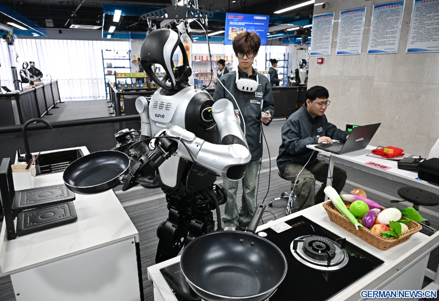 Das Foto zeigt Mitarbeiter bei Trainingsmaßnahmen und Datenerhebungen an einem humanoiden Roboter im Qingdao Humanoid Robot Data Training Center im Stadtbezirk Laoshan von Qingdao in der Provinz Shandong in Ostchina, 23. März 2026. (Xinhua/Li Ziheng)