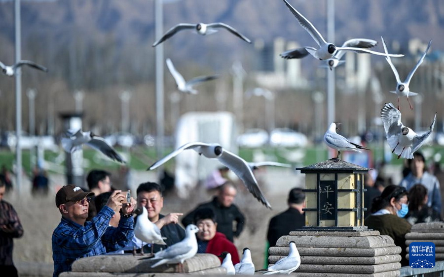 Touristen erfreuen sich an den riesigen Schwärmen von Lachmöwen am Wuhai-See. (Foto: Xinhua/Lian Zhen)
