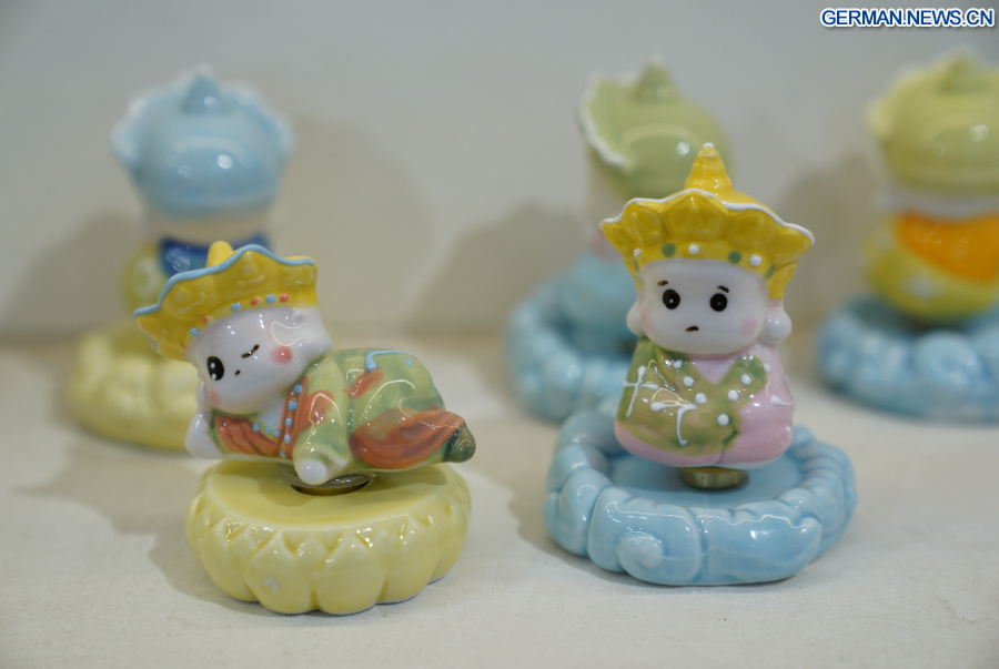 Das Foto zeigt vom „sprachlosen Buddha“ inspirierte Kultur- und Kreativprodukte im Atelier von Zeng Rui in Jingdezhen in der Provinz Jiangxi in Ostchina, 12. März 2026. (Xinhua/Zhou Mi)