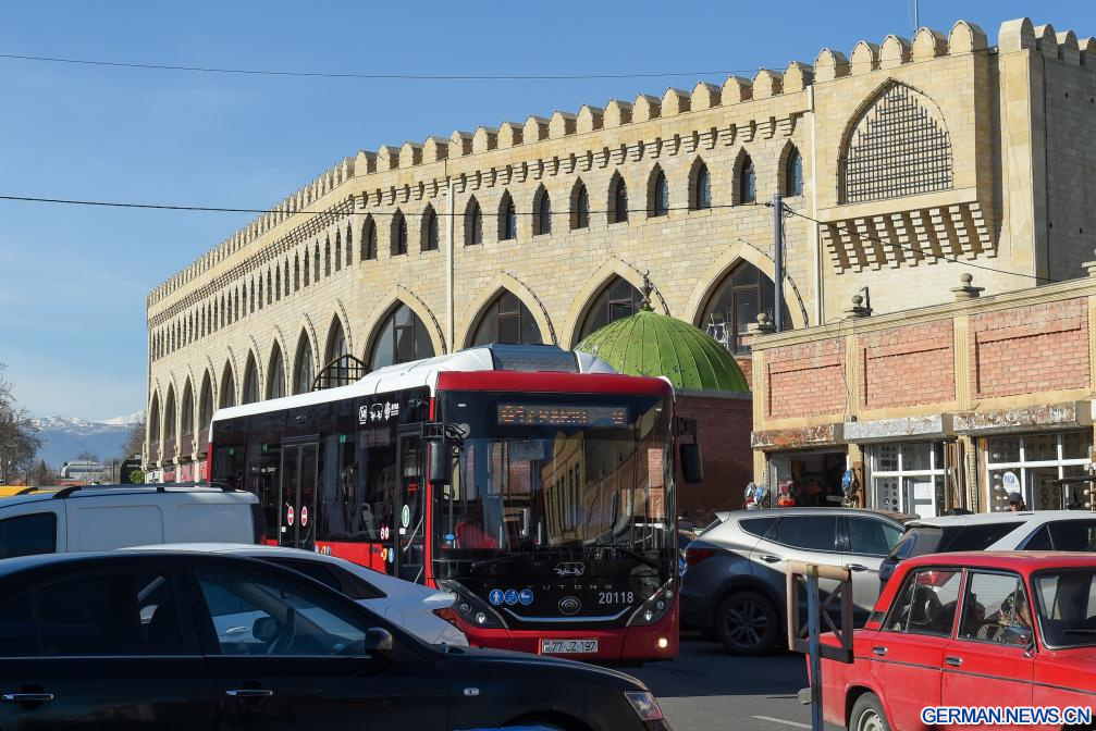 Busse chinesischer Marke auf Straße in Ganja in Aserbaidschan