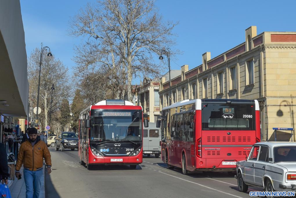 Busse chinesischer Marke auf Straße in Ganja in Aserbaidschan