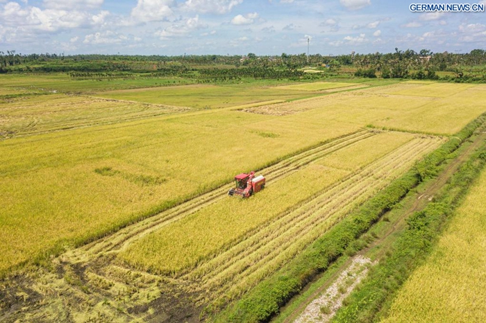 Das Drohnenfoto zeigt eine Erntemaschine bei der Reisernte auf einem Feld im Dorf Moqiao in der südchinesischen Stadt Haikou. (7. Juni 2025, Xinhua)