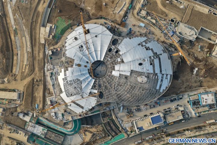 Die Luftaufnahme einer Drohne zeigt die Baustelle eines städtischen Kulturplatzes in der Xiong'an New Area in der Provinz Hebei in Nordchina, 25. März 2026. (Xinhua/Mu Yu)