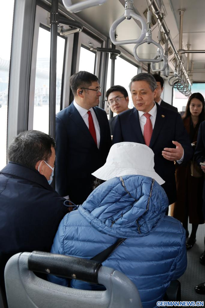 Wang Yajun (3. v. l., oben), chinesischer Botschafter in der Demokratischen Volksrepublik Korea (DVRK), unterhält sich mit anderen Reisenden in einem Shuttlebus am internationalen Flughafen Sunan in Pjöngjang, der DVRK, 30. März 2026.
