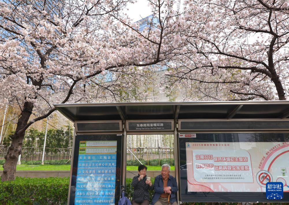 In Lujiazui, Shanghai, warten Bürger an einer Bushaltestelle unter Kirschblüten auf ihren Bus. (Foto vom 1. April, Xinhua/Liu Ying)