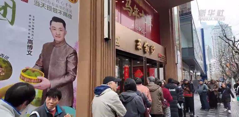 Vor der Hauptfiliale von Wangjiasha an der West Nanjing Road in Shanghai bildet sich am 27. März 2026 eine lange Schlange von Kunden, die alle Qingtuan kaufen wollen. (Videoscreenshot von Xinhua)