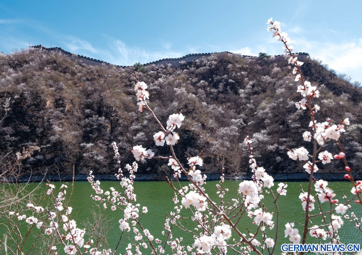 Das Foto zeigt die blühende Landschaft an der Großen Mauer am Seeufer bei Huanghuacheng im Stadtbezirk Huairou der chinesischen Hauptstadt Beijing, 1. April 2026. (Xinhua/Chen Yehua)