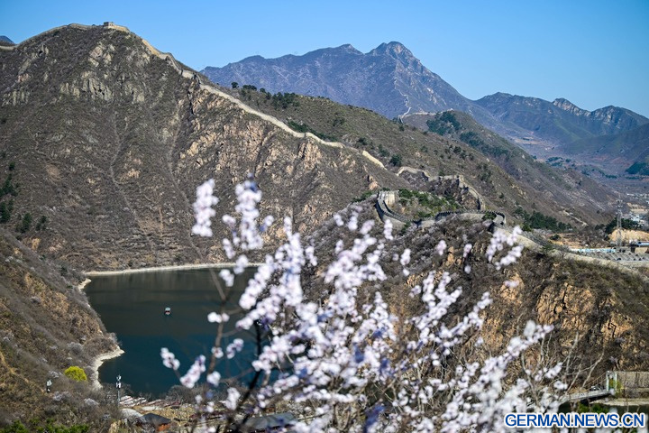 Das Foto zeigt die blühende Landschaft an der Großen Mauer am Seeufer bei Huanghuacheng im Stadtbezirk Huairou der chinesischen Hauptstadt Beijing, 1. April 2026. (Xinhua/Chen Yehua)