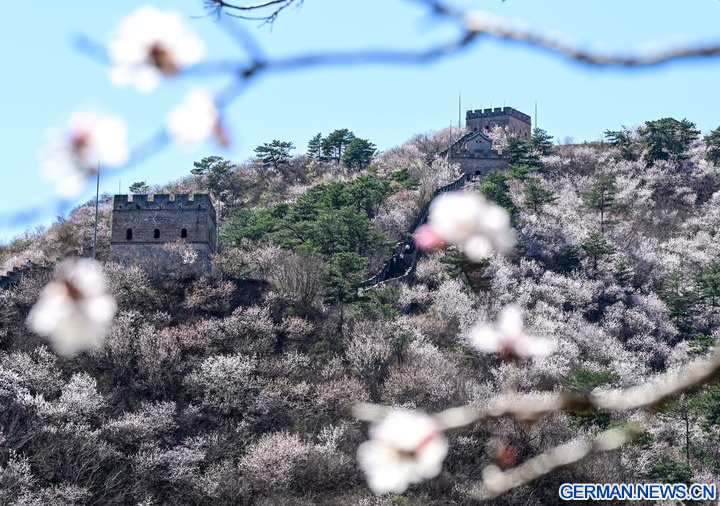 Das Foto zeigt die blühende Landschaft an der Großen Mauer am Seeufer bei Huanghuacheng im Stadtbezirk Huairou der chinesischen Hauptstadt Beijing, 1. April 2026. (Xinhua/Chen Yehua)