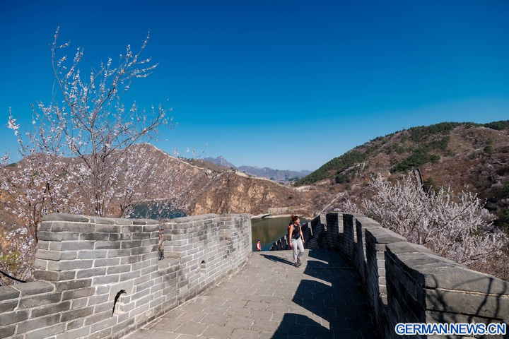 Touristen besuchen die Große Mauer am Seeufer bei Huanghuacheng im Stadtbezirk Huairou der chinesischen Hauptstadt Beijing, 1. April 2026. (Xinhua/Chen Yehua)
