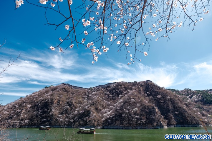 Das Foto zeigt die blühende Landschaft an der Großen Mauer am Seeufer bei Huanghuacheng im Stadtbezirk Huairou der chinesischen Hauptstadt Beijing, 1. April 2026. (Xinhua/Chen Yehua)