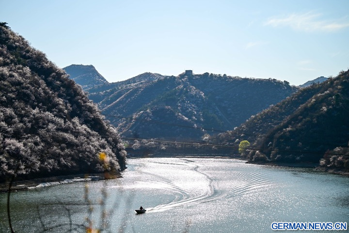 Das Foto zeigt die blühende Landschaft an der Großen Mauer am Seeufer bei Huanghuacheng im Stadtbezirk Huairou der chinesischen Hauptstadt Beijing, 1. April 2026. (Xinhua/Chen Yehua)
