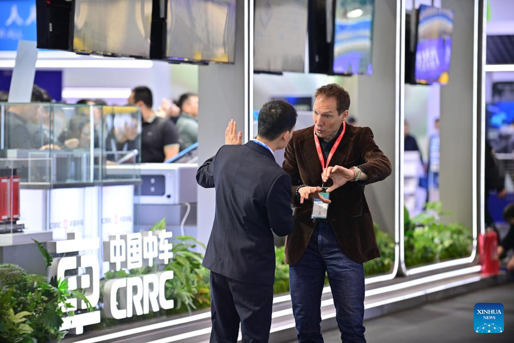 Ein Besucher (rechts) informiert sich über Energiespeicherprodukte der China Railway Rolling Stock Corporation (CRRC). (Foto vom 2. April 2026, Yin Dongxun/Xinhua)