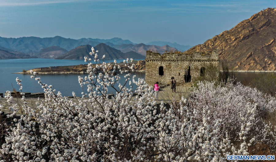 Die Drohnenaufnahme zeigt Touristen am Xifengkou-Abschnitt der Großen Mauer im Kreis Qianxi in der Stadt Tangshan in der nordchinesischen Provinz Hebei, 2. April 2026. (Foto von Liu Mancang/Xinhua)