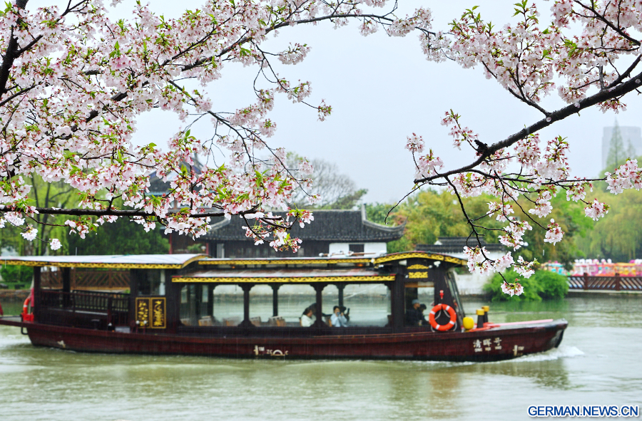 Touristen machen bei Regen eine Bootsfahrt, um die Sehenswürdigkeiten eines malerischen Gebiets in der Stadt Jiaxing in der ostchinesischen Provinz Zhejiang zu besichtigen, 3. April 2026. (Foto von Jin Peng/Xinhua)