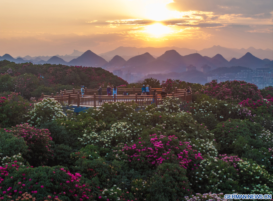 Die Drohnenaufnahme zeigt Touristen, die einen malerischen Ort mit Azaleen in der Stadt Bijie in der südwestchinesischen Provinz Guizhou besuchen, 29. März 2026. Die Azaleen in Bijie stehen derzeit in voller Blüte und ziehen zahlreiche Besucher an. (Foto von Li Hua/Xinhua)