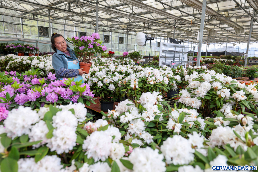 Eine Mitarbeiterin trägt gezüchtete Azaleen in einem Blumenforschungs- und Technologiepark in der Stadt Bijie in der südwestchinesischen Provinz Guizhou, 28. März 2026. Die Azaleen in Bijie stehen derzeit in voller Blüte und ziehen zahlreiche Besucher an. (Foto von Han Xianpu/Xinhua)