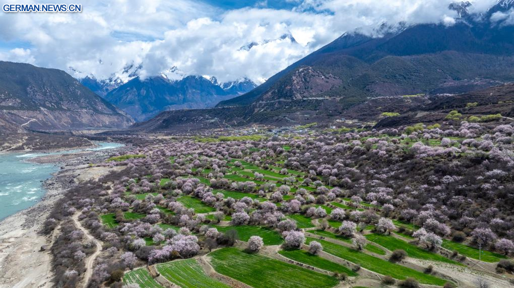 Mit steigenden Temperaturen stehen die Pfirsichbäume in Nyingchi in voller Blüte und ziehen zahlreiche Touristen an.