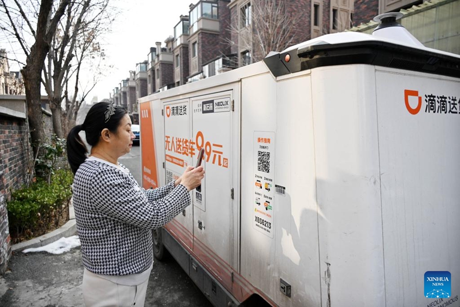 Zhou Li scannt mit ihrem Mobiltelefon einen QR-Code, um ihre Bestellung aus einem unbemannten Lieferfahrzeug in einer Wohnanlage im Stadtbezirk Chengyang in Qingdao in der ostchinesischen Provinz Shandong entgegenzunehmen. 28. Januar 2026 (Foto: Xinhua)