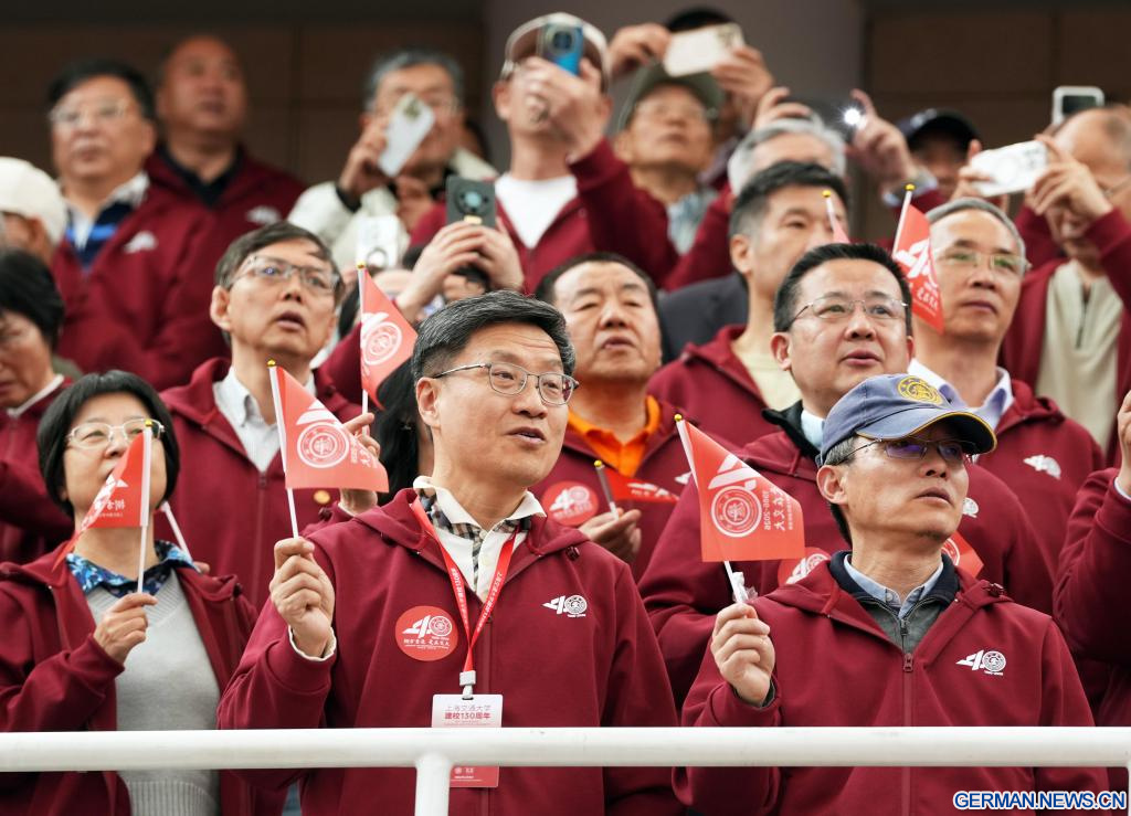 Alumni der Shanghai Jiao Tong University (SJTU) wohnen einer Zeremonie zum 130-jährigen Jubiläum der SJTU auf dem Minhang-Campus der Universität in Shanghai im Osten Chinas bei, 8. April 2026. (Quelle: Xinhua/Liu Ying)
