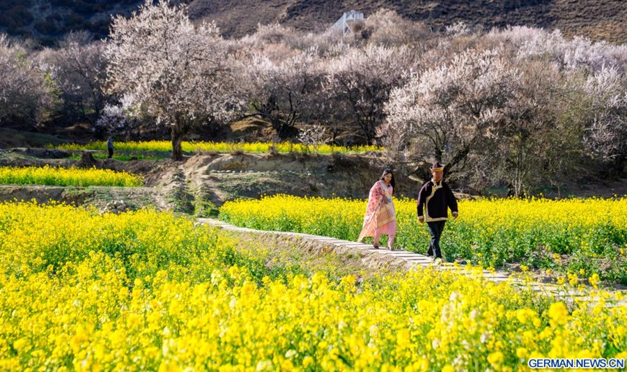 Touristen wandern inmitten blühender Blumen im Dorf Duodang der Stadt Nyingchi im südwestchinesischen Autonomen Gebiet Xizang. 3. April 2026. (Quelle: Xinhua/Tenzin Nyida)