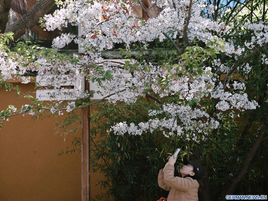 Eine Frau macht Fotos von Blüten in Shanghai in Ostchina, 7. April 2026. (Quelle: Xinhua/Xing Guangli)