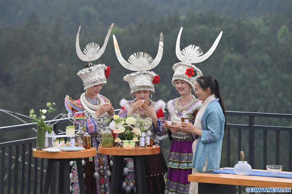 Menschen probieren Tee auf einer Teeplantage im Autonomen Kreis Rongshui der Miao in Liuzhou im südchinesischen Autonomen Gebiet Guangxi der Zhuang-Nationalität, 12. April 2026. (Quelle: Xinhua/Huang Xiaobang)