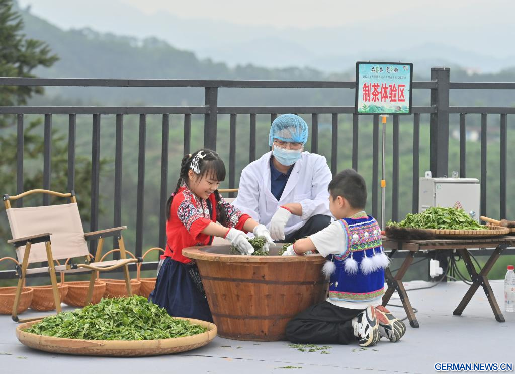 Kinder lernen die Teeherstellung auf einer Teeplantage im Autonomen Kreis Rongshui der Miao in Liuzhou im südchinesischen Autonomen Gebiet Guangxi der Zhuang-Nationalität, 12. April 2026. (Quelle: Xinhua/Huang Xiaobang)
