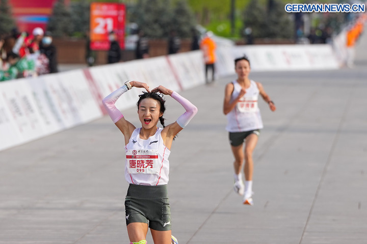 Teilnehmerinnen überqueren die Ziellinie beim Beijing-Halbmarathon 2026 in der chinesischen Hauptstadt Beijing, 12. April 2026. (Xinhua/Ju Huanzong)