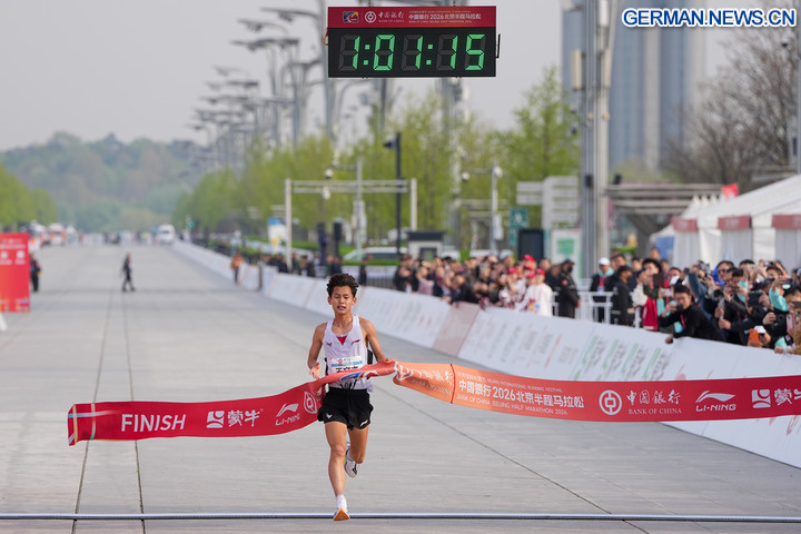 Wang Wenjie aus China überquert die Ziellinie und gewinnt den Titel bei den Männern beim Beijing-Halbmarathon 2026 in der chinesischen Hauptstadt Beijing, 12. April 2026. (Xinhua/Ju Huanzong)