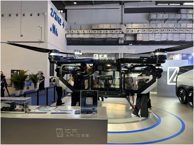 Ein silbergraues, stromlinienförmiges Fahrzeug, umgeben von Blitzlichtgewitter, ist besonders auffällig. Das ist der „Land Aircraft Carrier“ Aridge, ein zweiteiliges Flugauto für Straße und Luft von der Guangdong Huitian Aerospace Technology Co., Ltd.
