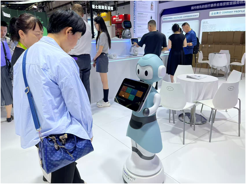 Doch nicht nur Flugautos sind zu sehen. Besonders Roboter dürfen nicht fehlen. Unter den verschiedenen Robotern zieht ein Roboter von Fubao Robot mit seinem niedlichen Aussehen und auch seinem leistungsfähigen Können die Aufmerksamkeit vieler Besucher auf sich. Er misst Blutdruck, Sauerstoffsättigung, Blutzucker und Harnsäure, erinnert an die Medikamenteneinnahme und plaudert mit Senioren. „Solch ein Roboter ist auf dem Markt sehr gefragt, weil viele die entsprechenden Bedürfnisse haben“, erklärt ein Besucher, der sich für den Roboter interessiert.