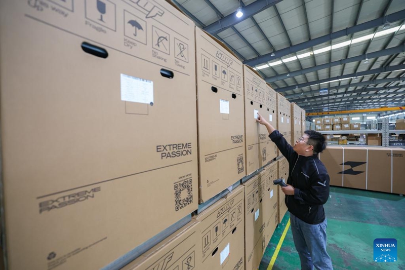 Ein Mitarbeiter überprüft Motorräder von ZXMOTO, die für Exporte bestimmt sind. (1. April 2026, Xinhua)