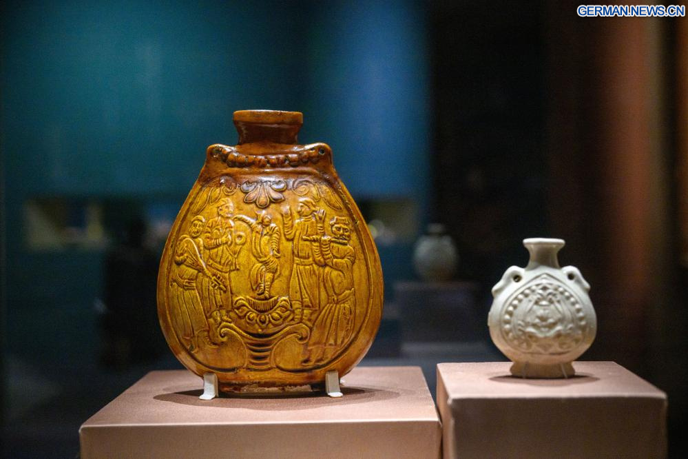 Das am 13. April 2026 aufgenommene Foto zeigt Exponate auf der Ausstellung „Ein Blick auf China im 6. - 7. Jahrhundert: Funde aus dem Grab von Li Jingxun“ im Chinesischen Nationalmuseum in Chinas Hauptstadt Beijing. (Quelle: Xinhua/Jin Liangkuai)