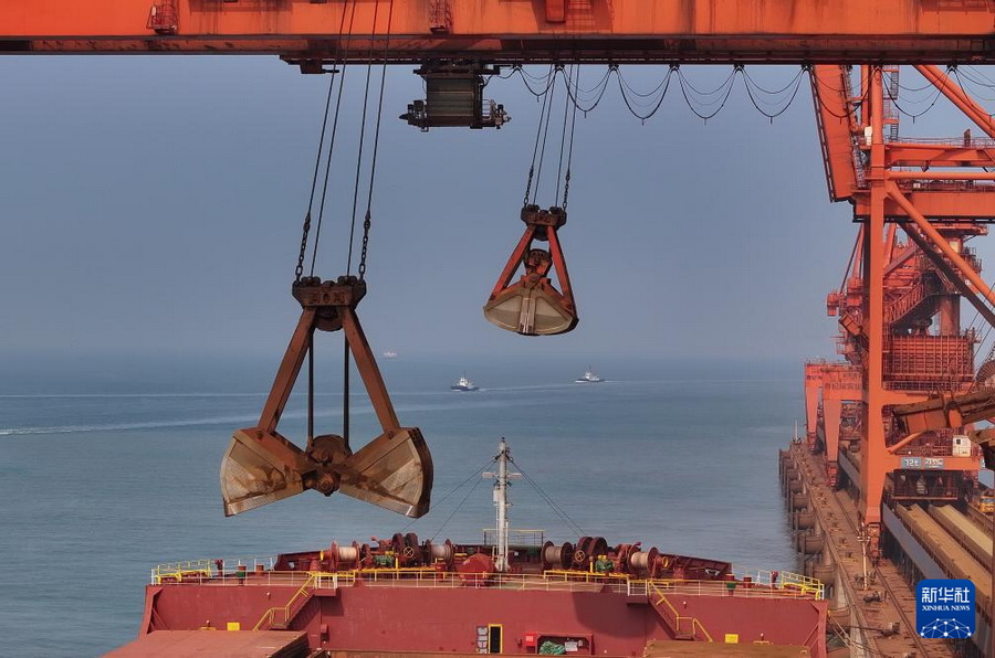 Ein Frachter liegt am Erzterminal des Hafens Caofeidian fest, während die Ladung gelöscht wird. (Foto: Yao Shiyao/ Xinhua)