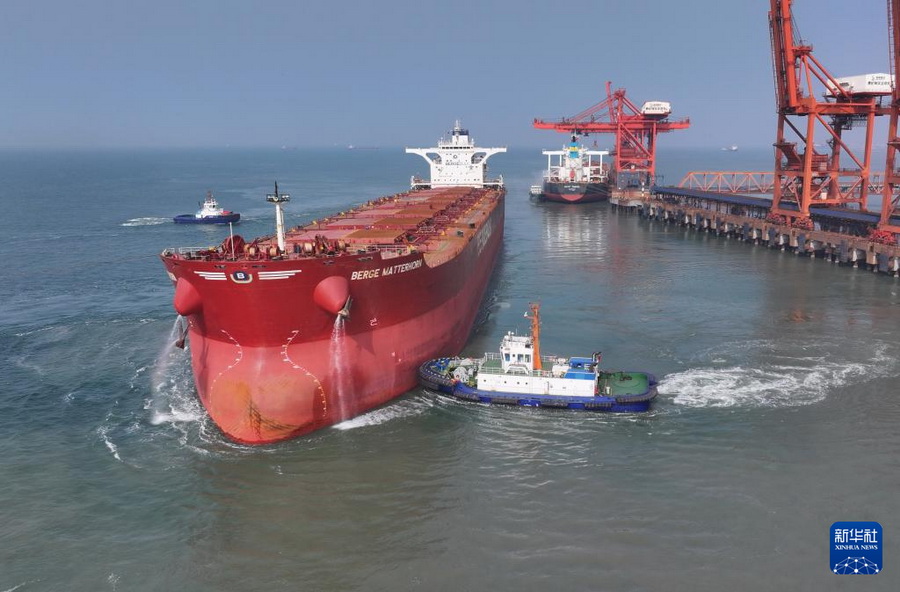 Ein Frachter verlässt mit Schlepperhilfe das Hafengebiet von Caofeidian in Richtung der Schifffahrtswege. (Foto: Yao Shiyao/ Xinhua)