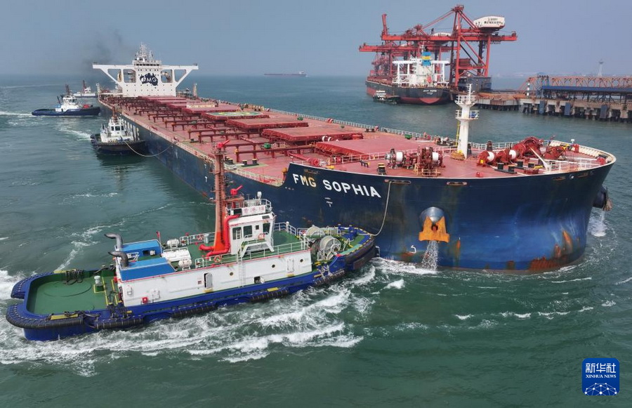 Mit Unterstützung von Schleppern manövriert ein Frachtschiff sicher an seinen Liegeplatz im Erzterminal. (Foto: Yao Shiyao/ Xinhua)