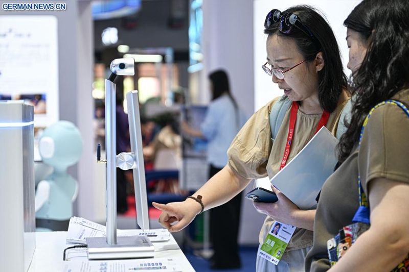 Besucher informieren sich am Stand von Fubao Robot auf der sechsten China International Consumer Products Expo (CICPE) in Haikou in der südchinesischen Provinz Hainan über einen KI-gestützten Roboter für psychologische Untersuchungen, 14. April 2026. Auf der laufenden CICPE wird eine breite Palette innovativer Verbraucherprodukte präsentiert, die auf Technologien der künstlichen Intelligenz basieren und verschiedene Sektoren abdecken, darunter intelligente Interaktion, tragbare Geräte und intelligente Gesundheitspflege. (Quelle: Xinhua/Pu Xiaoxu)