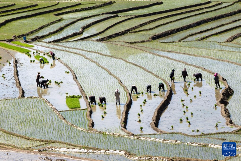 Dorfbewohner pflanzen Reissetzlinge auf Terrassenfeldern im Kreis Ganluo in der südwestchinesischen Provinz Sichuan, 18. April 2026. (Quelle: Xinhua/Jiang Hongjing)