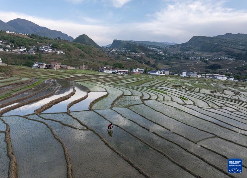 Die Luftaufnahme einer Drohne vom 18. April 2026 zeigt Terrassenfelder im Kreis Ganluo in der südwestchinesischen Provinz Sichuan. (Quelle: Xinhua/Jiang Hongjing)