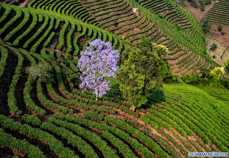 Die Luftaufnahme einer Drohne zeigt einen Teegarten im Bezirk Simao der Stadt Pu'er in der Provinz Yunnan im Südwesten Chinas, 15. April 2026. (Xinhua/Chen Xinbo)
