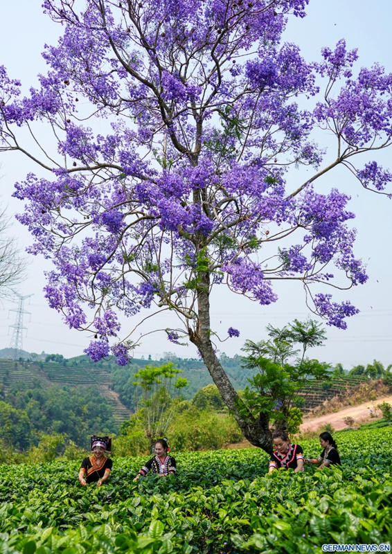Landwirtinnen pflücken Teeblätter in einem Teegarten im Bezirk Simao der Stadt Pu'er in der Provinz Yunnan im Südwesten Chinas, 15. April 2026. (Xinhua/Chen Xinbo)