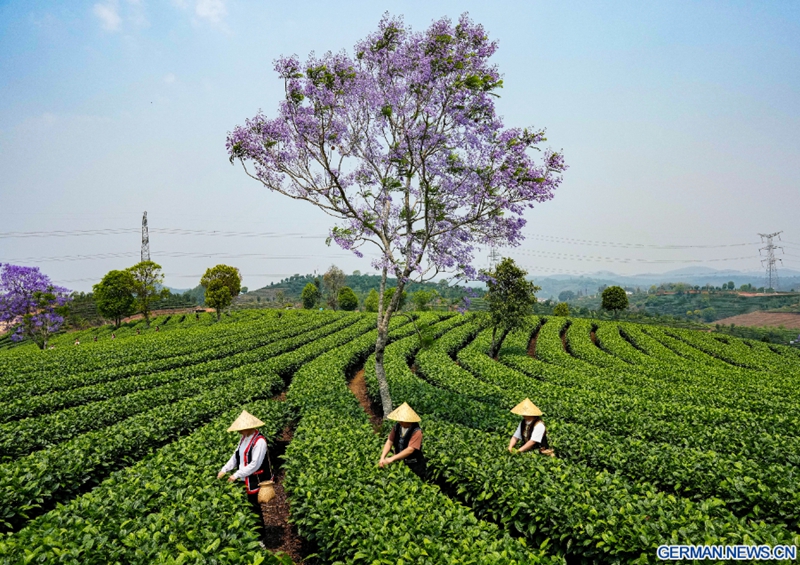 Landwirte pflücken Teeblätter in einem Teegarten im Bezirk Simao der Stadt Pu'er in der Provinz Yunnan im Südwesten Chinas, 15. April 2026. (Xinhua/Chen Xinbo)