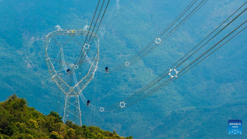 Techniker inspizieren einen Abschnitt der Stromleitung des 500-kV-Projekts in Xishuangbanna. (14. April 2026, Xinhua)