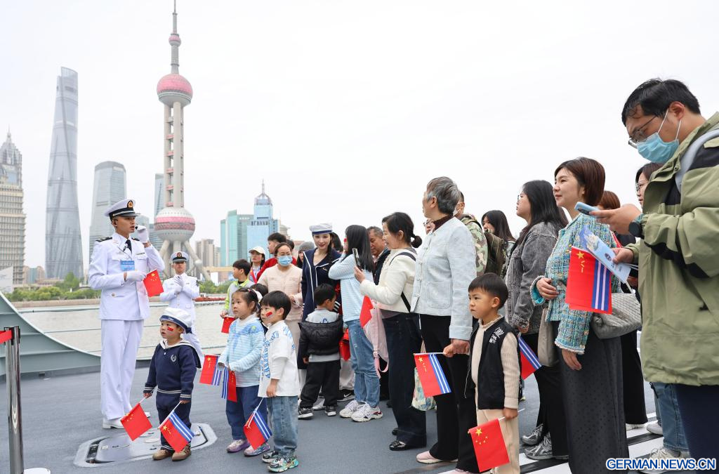 Menschen besichtigen das Schiff „Fuyang“ der Marine der Chinesischen Volksbefreiungsarmee (VBA) während eines Tages der offenen Tür in Shanghai in Ostchina, 21. April 2026. (Quelle: Xinhua/Fang Zhe)