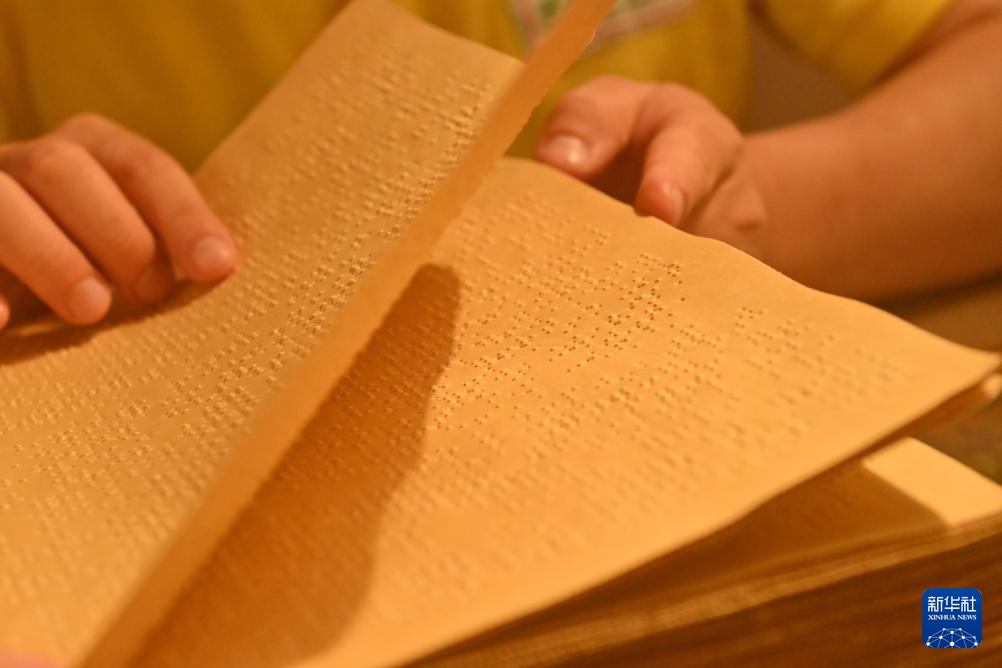 Zeng Qiaoming ist in der Leseecke in ein Buch vertieft, das in Brailleschrift verfasst ist. (Foto: Lu Boan/ Xinhua)