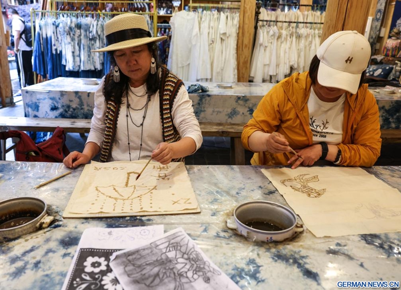 Touristen zeichnen Muster auf Stoffe im Dorf Zhaoxing der Dong im Kreis Liping in der südwestchinesischen Provinz Guizhou, 20. April 2026.