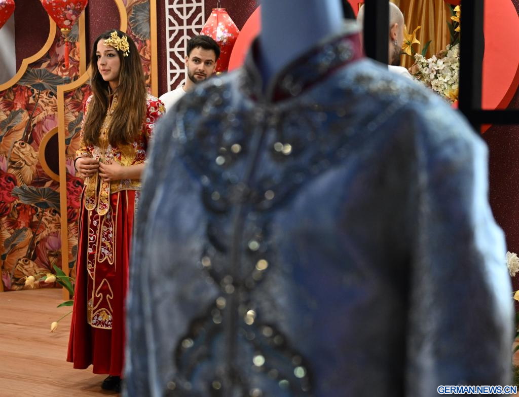 Eine Frau probiert bei der „Macao Night“ in Madrid Kleidungsstücke im chinesischen Stil an. (Foto: Xinhua/Cheng Min)