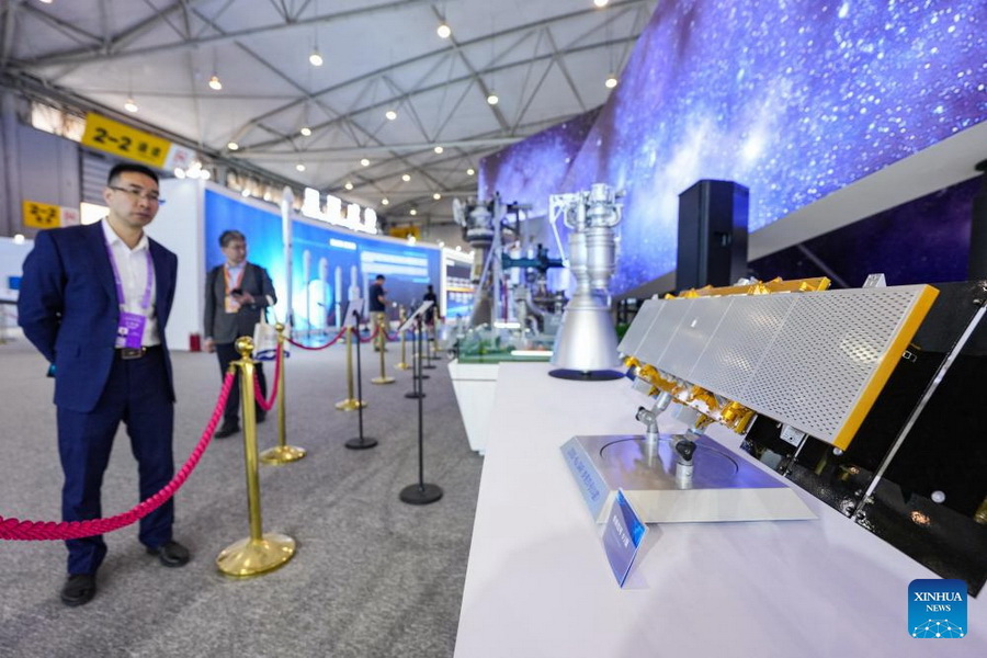 Gäste betrachten Satellitenausstellungen auf einer Luft- und Raumfahrtausstellung in Chengdu, Provinz Sichuan im Südwesten Chinas, 24. April 2026. (Foto: Xinhua/Wang Xi)