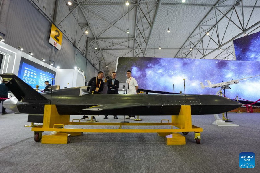 Gäste betrachten eine Drohne, die auf einer Luft- und Raumfahrtausstellung ausgestellt wird. (Foto: Xinhua/Wang Xi)